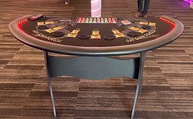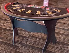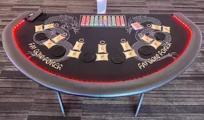 Our Lighted Casino Tables have 16 colors to choose from. They have leather padded armrests, speed felts, metal cup holders, drink rails, and include all accessories necessary for each table such as cards, dice, casino chips, discard trays, markers, and the option to add chairs/bar stools.